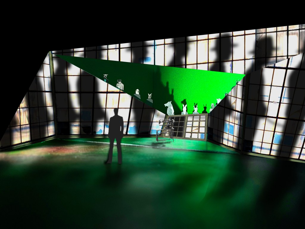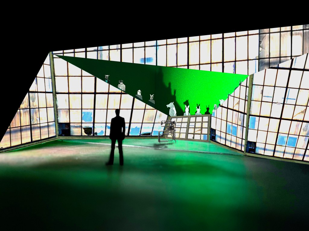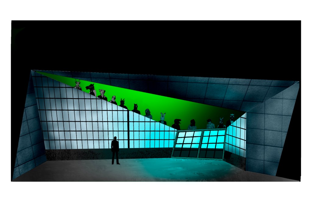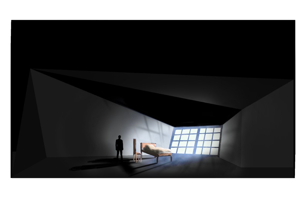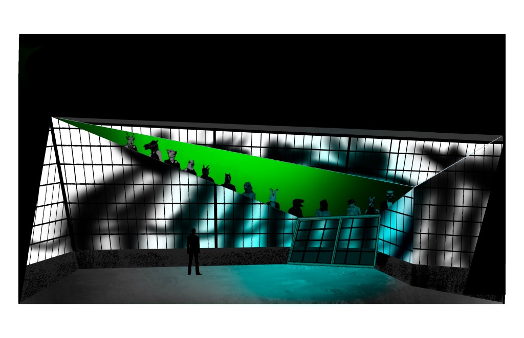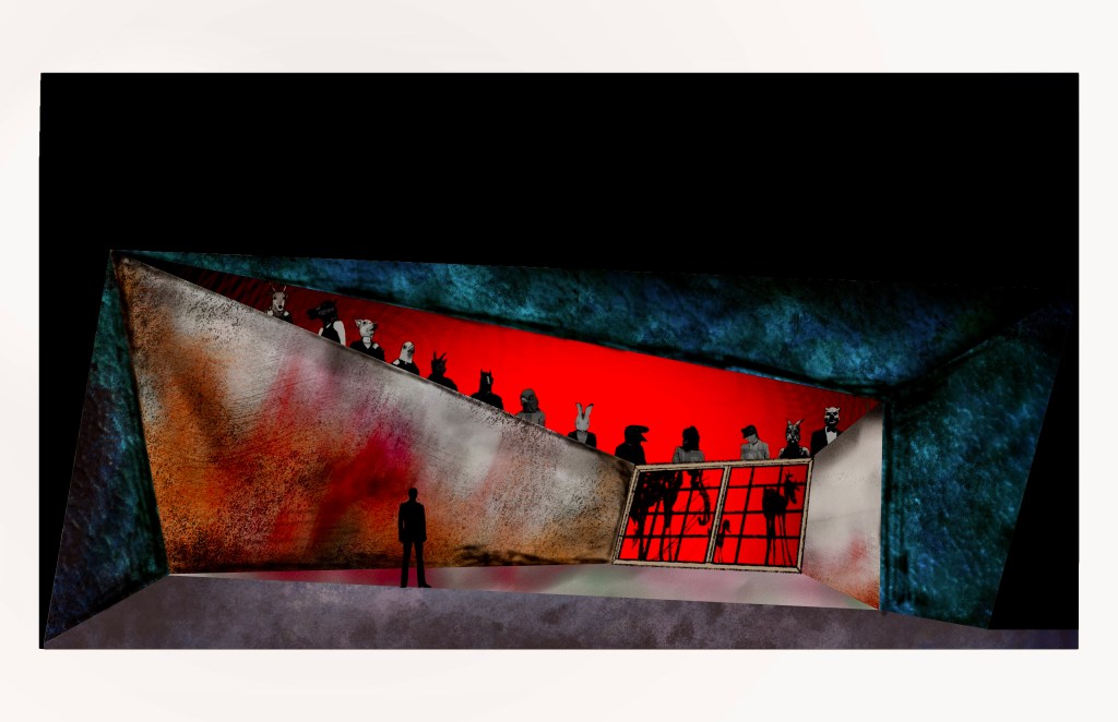 In order to create an immersive theatre experience that brings the audience into an absurd, grotesque, and terrifying world. I use a three-sided immersive stage that encloses the audience within a structured space. The tilted walls, unstable constructions, and the extended spaces interrupted by window frames—will heighten anxiety. Both the audience and actors will exist within this world, blurring the line between performance and reality.