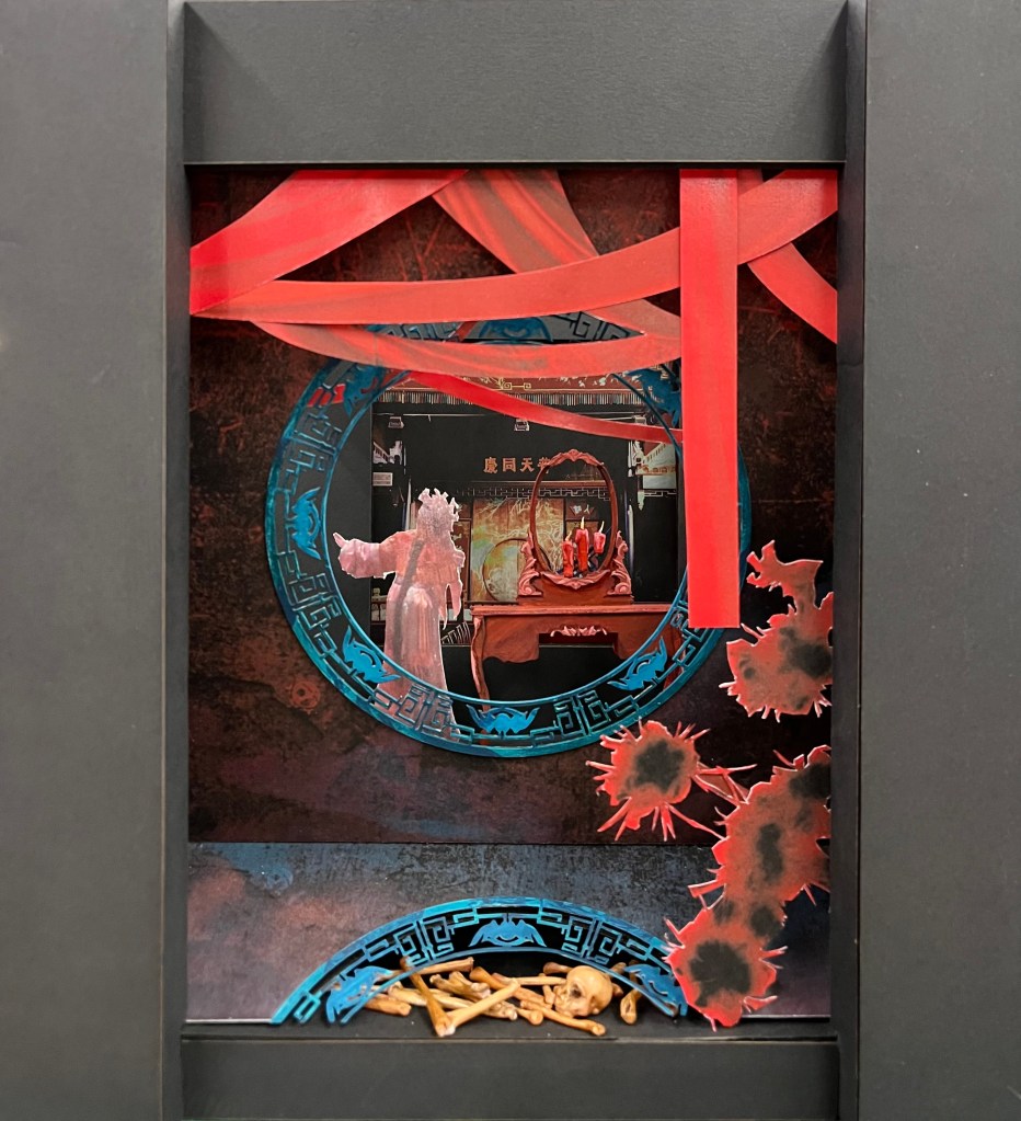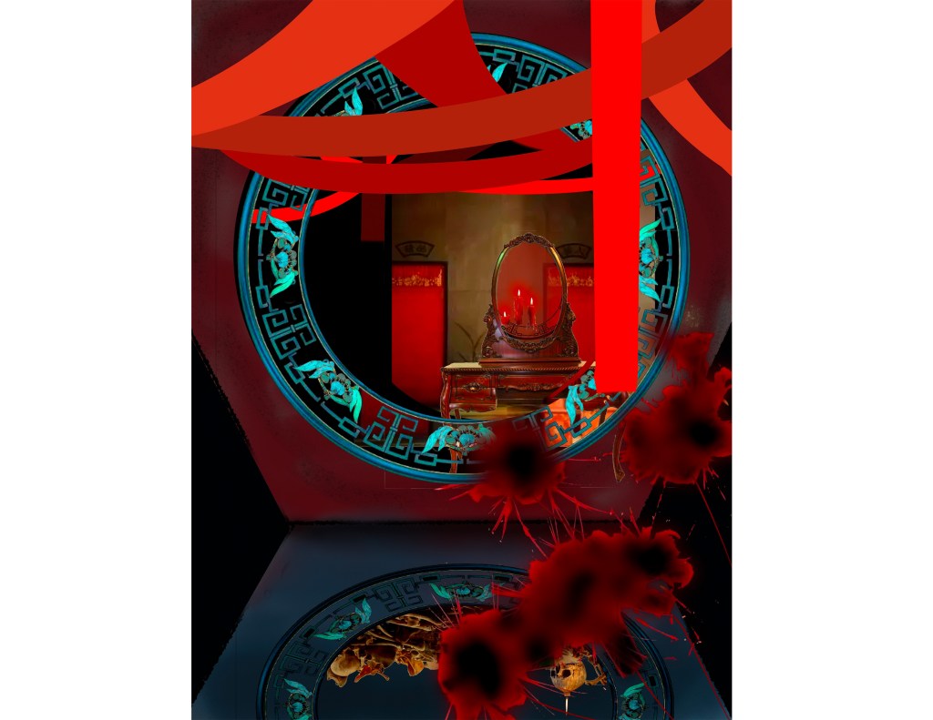 In this story, many people died cause of violence, disease, poverty. So I want a real world full of corpses. Another mirror world is the dream that Cheng doesn’t want to wake up, or I want to interpret this as the world he comes to after he suicide, in this world he and Bawang got married, these red candles, red drapery, dressing mirror is the wedding scene,