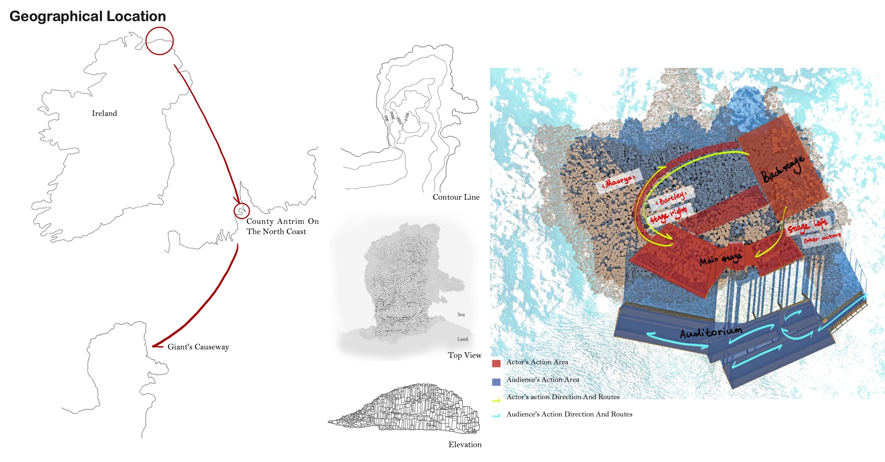 I designed the stage for John Millington Synge’s “Riders to the Sea”, a one-act play as site-specific theatre, is builded on the natural terrain of the Giant’s Causeway. Choosing the iconic natural landscape of Ireland, the author’s homeland and the location where the play was written, tens of thousands of hexagonal stone pillars of the Giant’s Path are formed in nature. In the play, the author wants the audience to think about the interplay between man and nature. Its huge taupe stone clumps add tension, solemnity and sharpness to the scene.